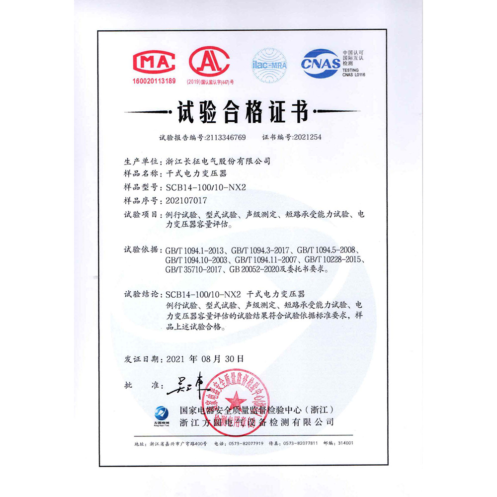 SCB14-100/10-NX2干式電力變壓器 試驗合格證書
