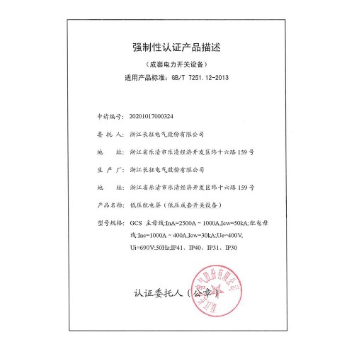 GCS低壓配電屏(低壓成套開關設備)強制性認證產品描述