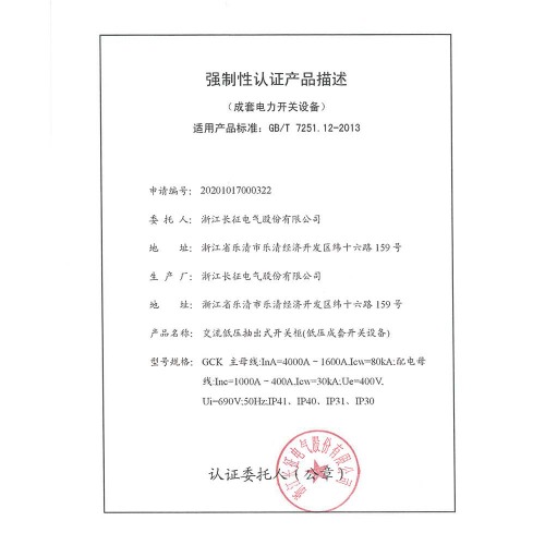 GCK 4000A~1600A交流低壓抽出式開關柜(低壓成套開關設備)強制性認證產品描述