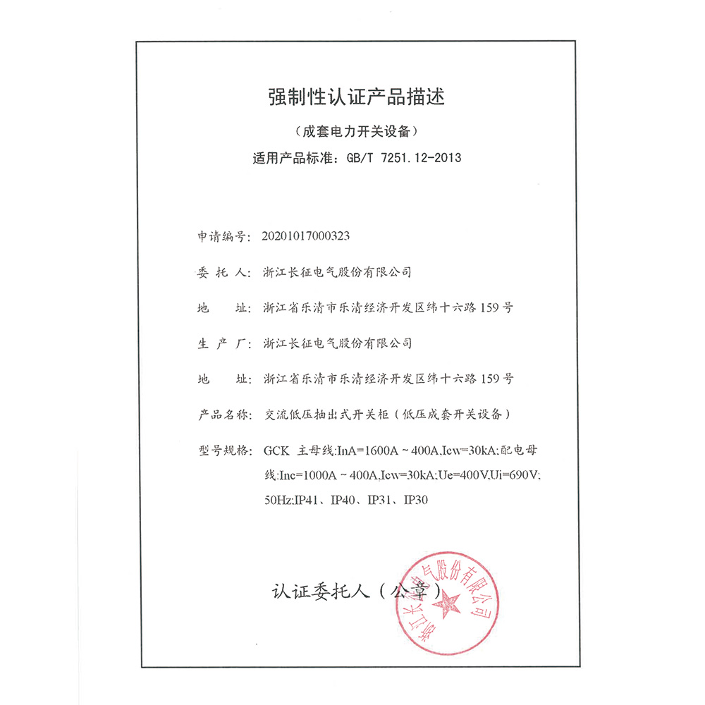 GCK 1600A~400A交流低壓抽出式開關柜(低壓成套開關設備)強制性認證產品描述